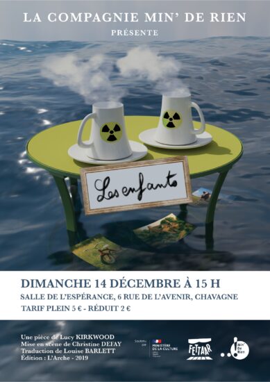 LES ENFANTS par la compagnie Min’de rien (de Lucy Kirkwood – traduction Louise Barlett) 📌Avec humour et tendresse, trois boomers s’interrogent sur l’avenir dumonde. Faut-il apprendre à vouloir moins ? Pouvons-nous encore sauverla planète pour nos enfants ? 📌Gratuit pour les moins de 8 ans 📌2 € pour les moins» Lire la suite «