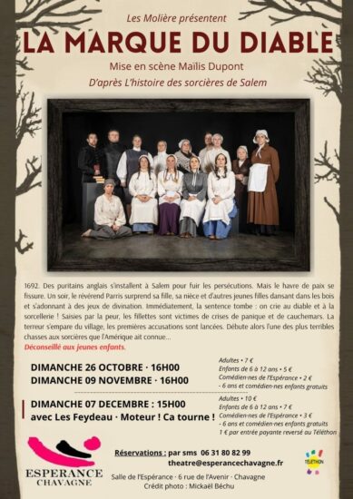 Plongez au cœur d’un des chapitres les plus sombres de l’histoire américaine ! La troupe « Les Molière » de l’Espérance Chavagne vous présente « La Marque du Diable », une pièce de théâtre intense et captivante d’après l’histoire des procès en sorcellerie de Salem. En 1692, la peur s’empare d’un village puritain. Entre» Lire la suite «