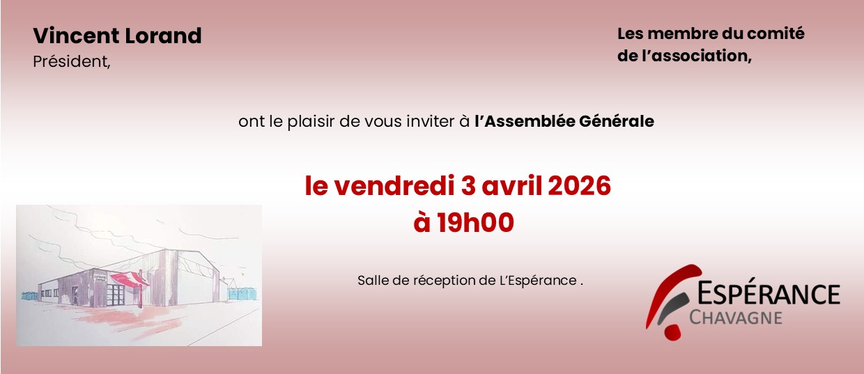 Chers adhérents : Nous avons le plaisir de vous convier à la prochaine Assemblée Générale de l’association Espérance, qui se tiendra : Vendredi 3 avril 2026 , à 19h00, Salle de Réception de l’association -6 rue de l’Avenir – 35310 Chavagne L’Assemblée débutera par un moment convivial. L’ordre du jour» Lire la suite «